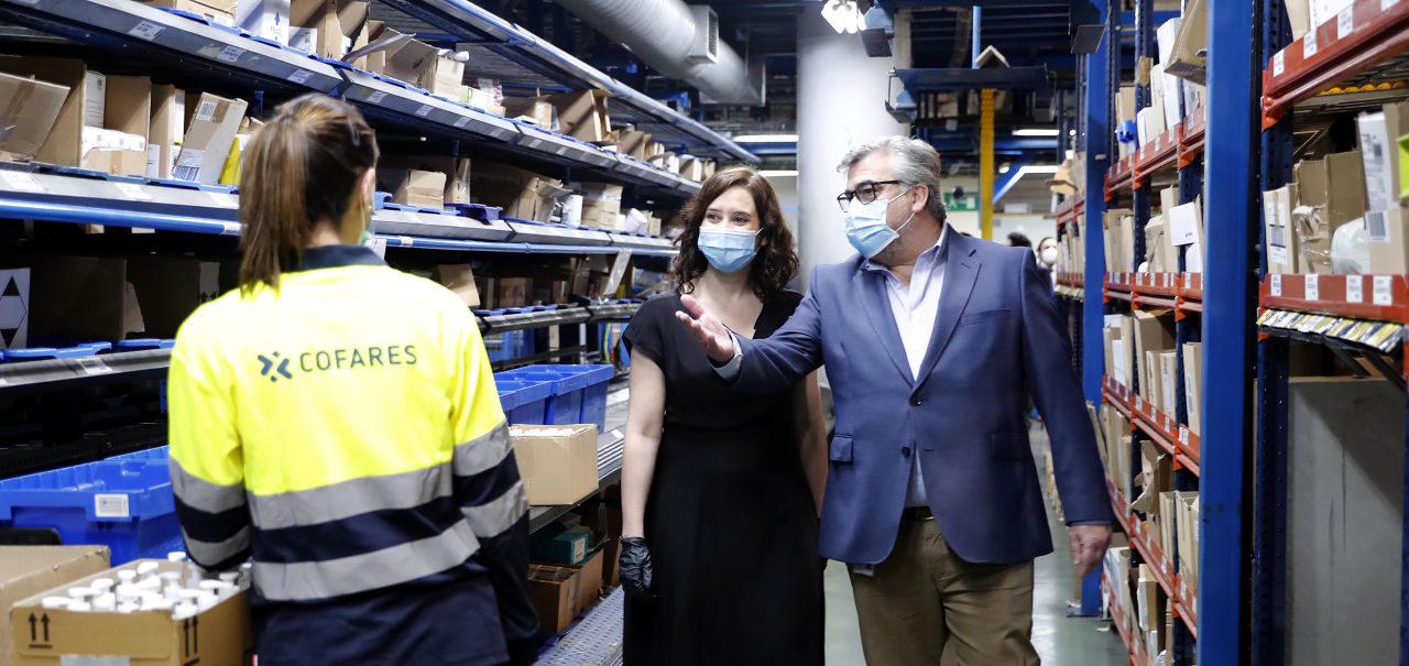 La presidenta de la Comunidad de Madrid, Isabel Díaz Ayuso, ha visitado uno de los almacenes de la distribuidora de medicamentos Cofares, en Móstoles, donde ha reconocido el trabajo de los farmacéuticos.