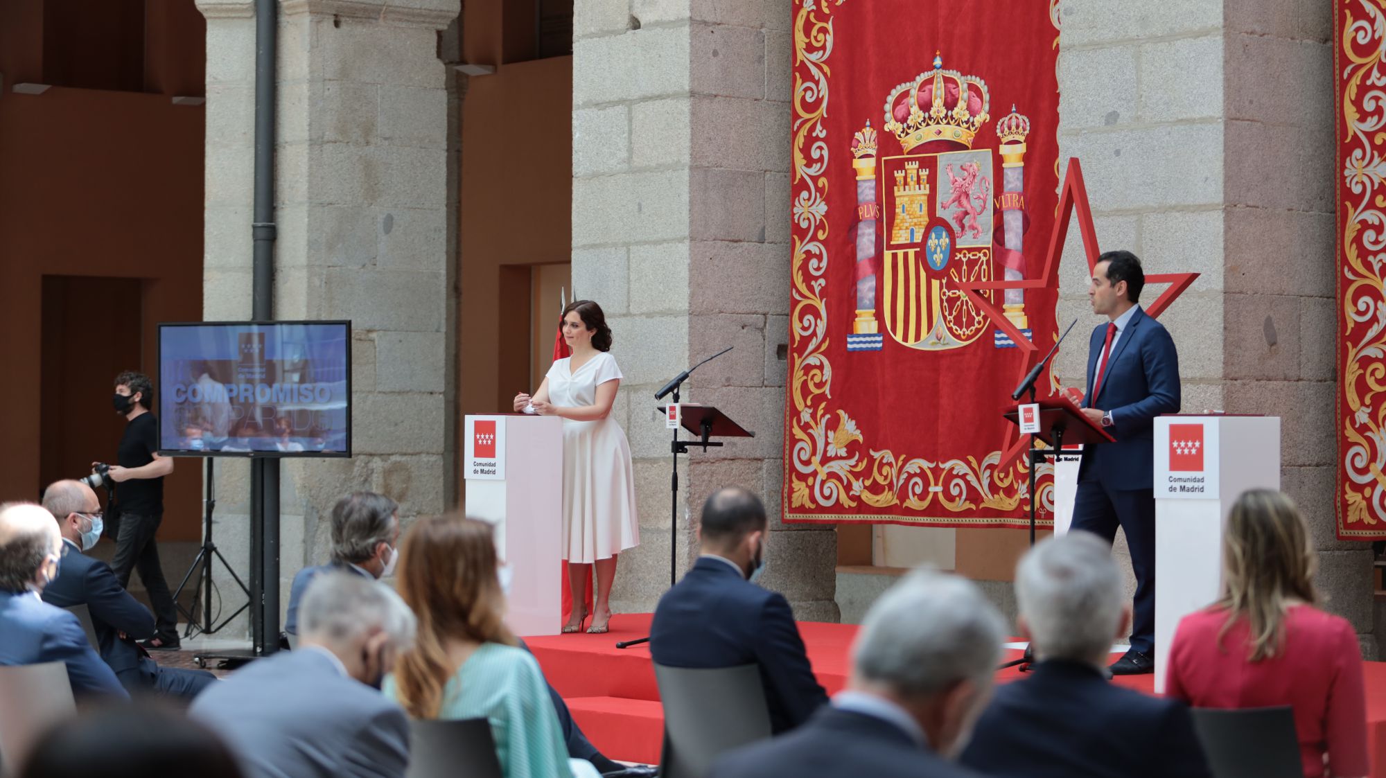 La presidenta de la Comunidad de Madrid, Isabel Díaz Ayuso, acompañada por el vicepresidente, Ignacio Aguado, hace balance del primer año desde la firma del acuerdo de Gobierno.