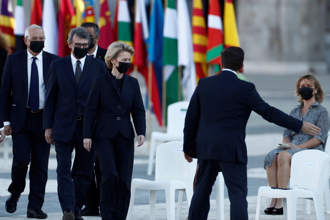 El Alto Representante para la Política Exterior y de Seguridad, Josep Borrell (i), el presidente del Parlamento Europeo, David Sassoli (2i), y la presidenta de la Comisión Europea, Ursula von der Leyen (2d), a su llegada al Patio de la Armería.