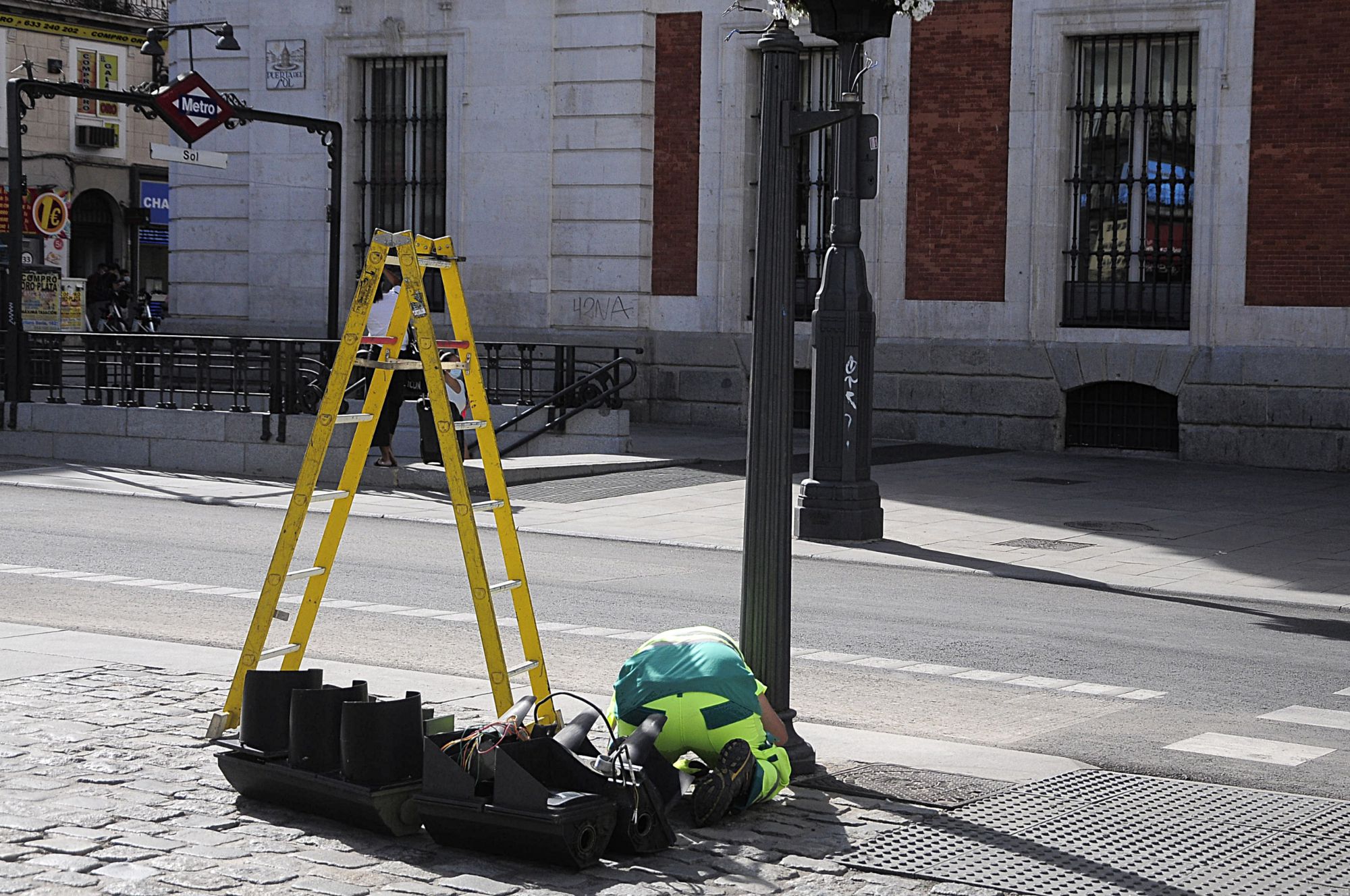 Un operario retira los semáforos de la calle Mayor a su paso por la Puerta del Sol