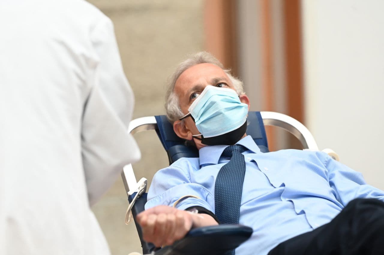 La presidenta de la Comunidad de Madrid, Isabel Díaz Ayuso, ha recibido este miércoles en la Real Casa de Correos, sede del Gobierno regional, a los primeros madrileños que han acudido a donar sangre en el dispositivo especial que se ha habilitado en el patio principal.