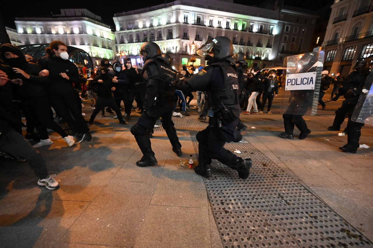 Algunos de los participantes en la concentración de la Puerta del Sol contra de la entrada en prisión de Pablo Hasel se han enfrentado a la policía que ha tenido que cargar. (1236 visitas)