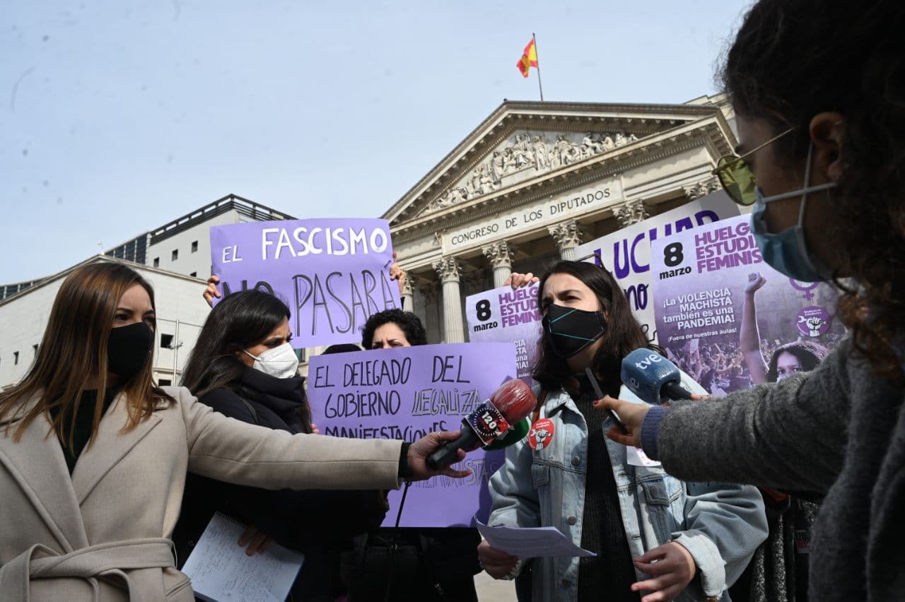 Una representación del Sindicato de Estudiantes se concentra frente al Congreso de los Diputado contra la decisión de la delegación del Gobierno sobre la manifestación del 8M, Día de la Mujer, y advirtiendo que "este 8M nos vemos en las calles".