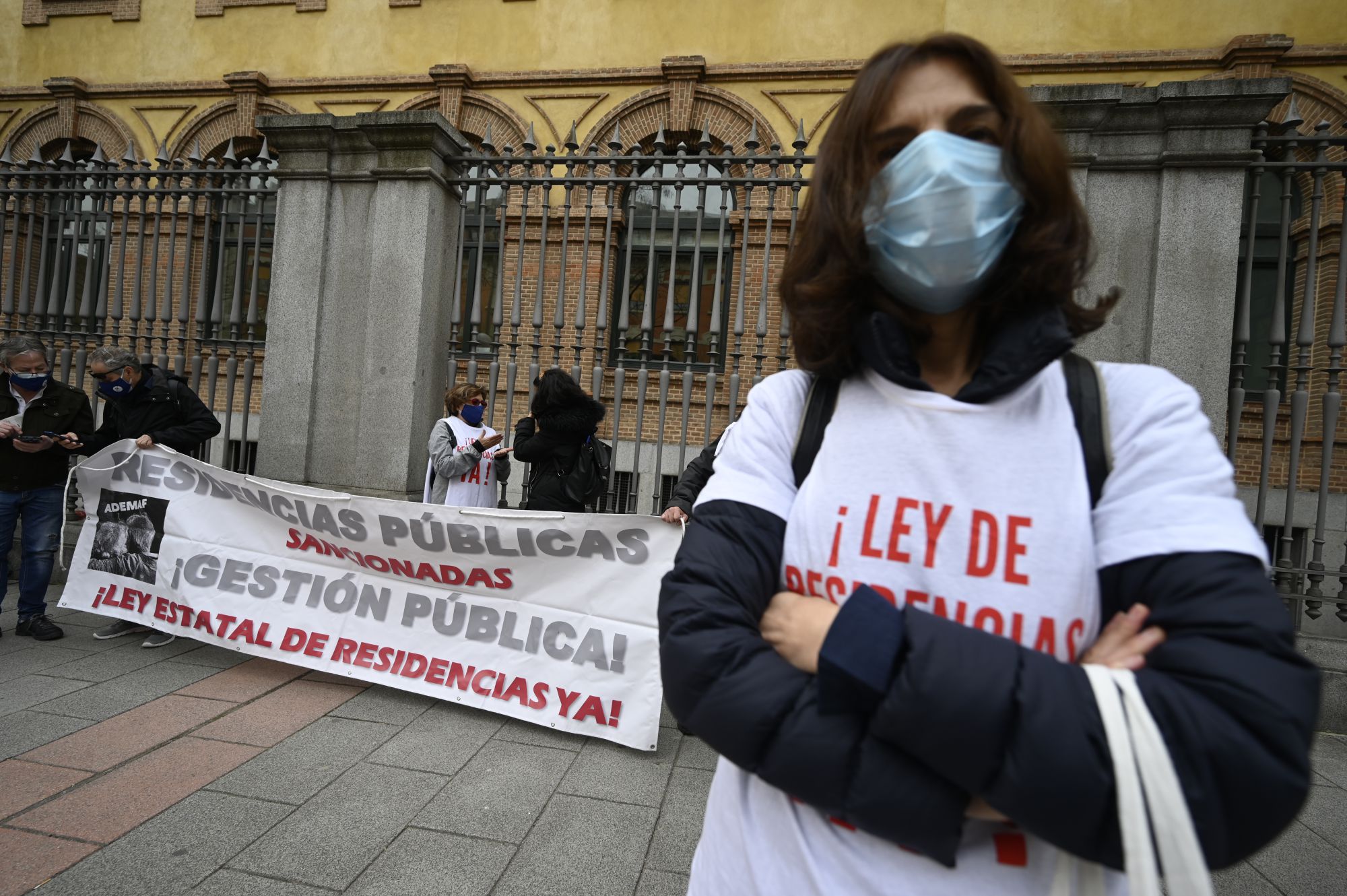 La Marea de Residencias y la Asociación en Defensa de los Mayores en Residencias (ADEMAF) se han concentrado frente a la Consejería de Políticas Sociales de Madrid contra el Acuerdo Marco negociado con los empresarios, que dicen se ha firmado "a sus espaldas".