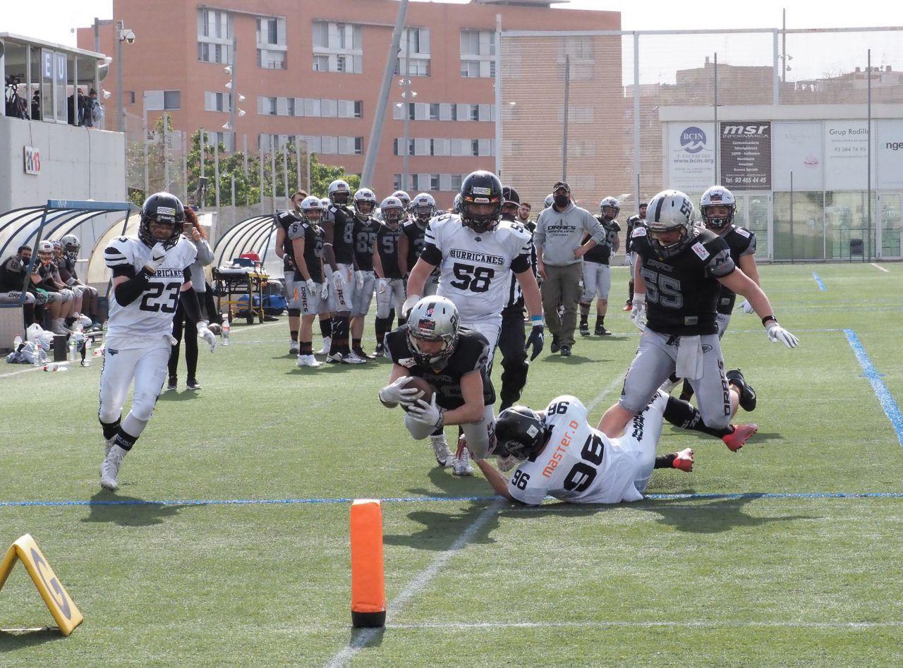 Partido de liga de fútbol americano entre Badalona Lidertel Dracs y Zaragoza Hurricanes.