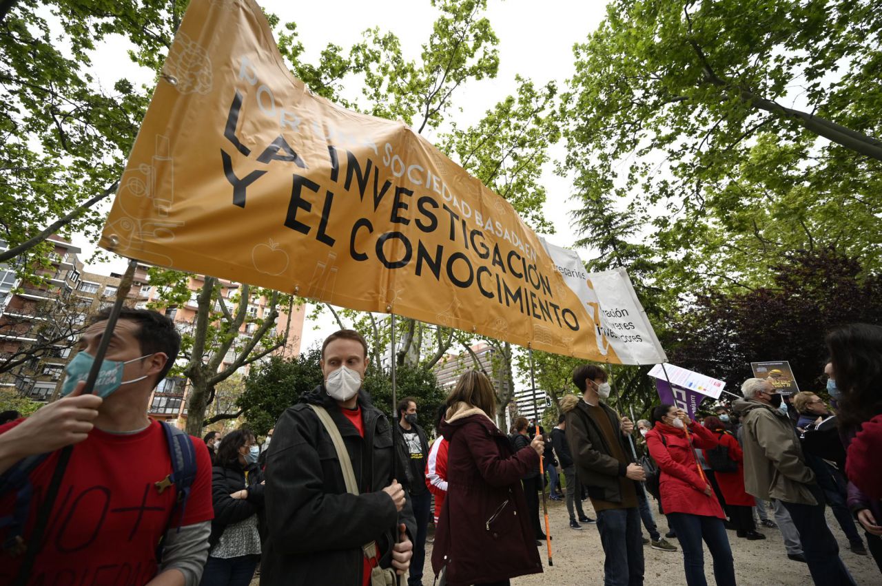 Diferentes colectivos pertenecientes al mundo de la investigación se ha concentrado este jueves frente al frente a la sede del Ministerio de Ciencia, en el Paseo de la Castellana, para frenar la reforma de la Ley 14/2011 de la Ciencia, la Tecnología y la Innovación, ya presentada al Consejo de Ministros.