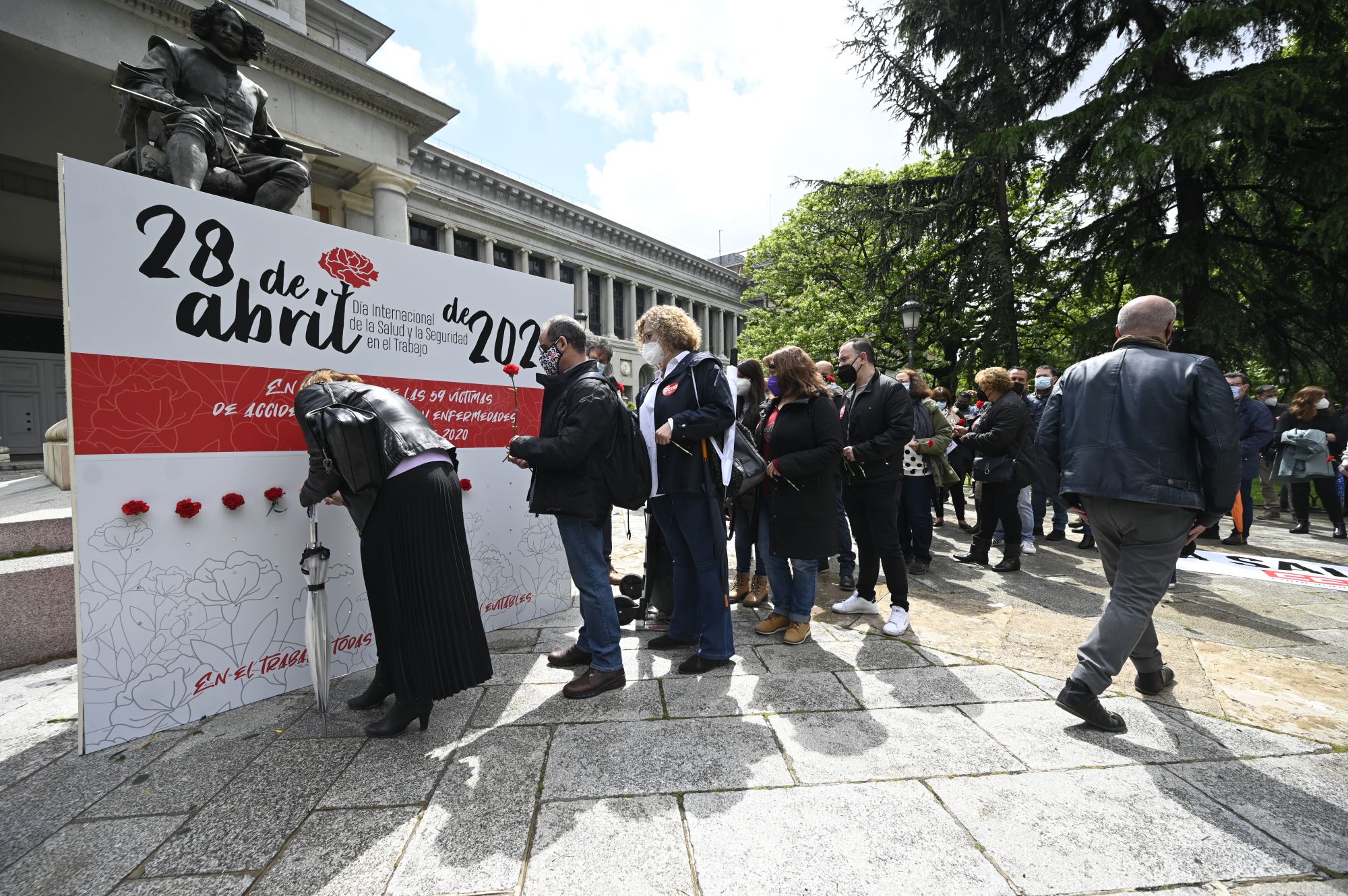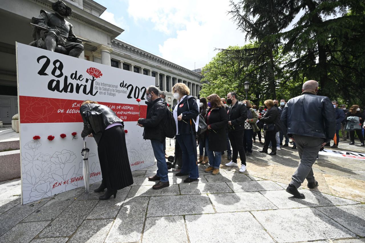 Los sindicatos CCOO y UGT se han concentrado este miércoles en memoria de las víctimas de los accidentes laborales registrados en la región con motivo del Día Mundial de la Seguridad y la Salud en el Trabajo. El acto se ha desarrollado frente a la estatua de Velázquez del Museo del Prado.