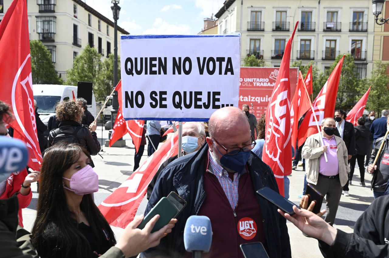 Durante el día de hoy sindicatos de CC.OO y UGT se han concentrado en la Plaza de Isabel II de Ópera, para leer un manifiesto reclamando el voto a la "izquierda progesista", con el fin de frenar las "políticas ultraliberales" que ha llevado a cabo el Partido Popular durante 26 años.