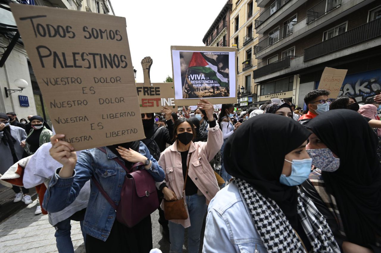 Centenares de personas se han concentrado este sábado en el centro de Madrid en solidaridad con el pueblo palestino en plena escalada de tensión entre palestinos e israelies. (2728 visitas)