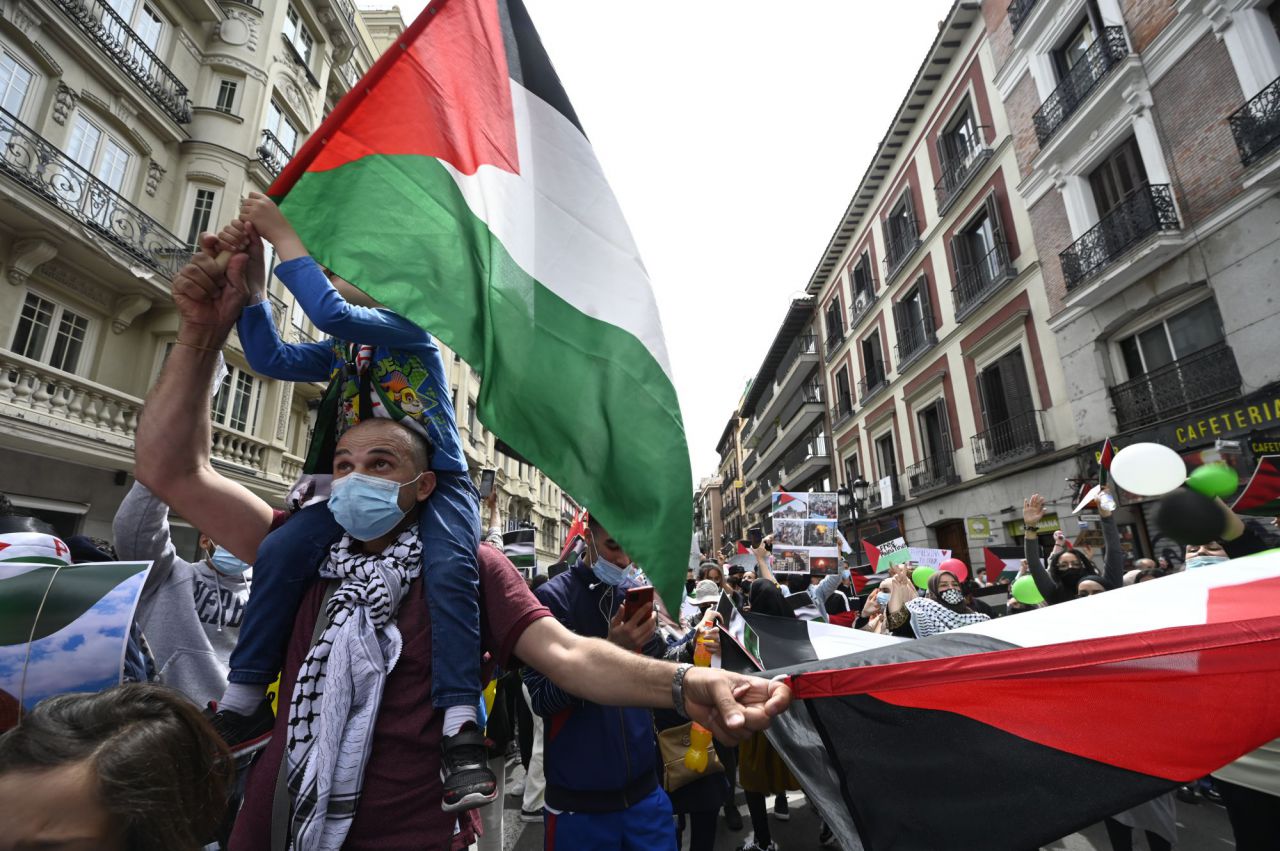 Centenares de personas se han concentrado este sábado en el centro de Madrid en solidaridad con el pueblo palestino en plena escalada de tensión entre palestinos e israelies. (2728 visitas)