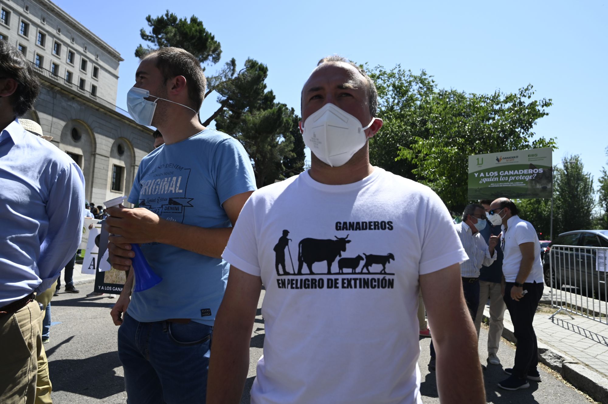 Ganaderos procedentes de toda España, convocados por la plataforma Ganader@ Viv@, se han manifestado este miércoles frente a la sede del Ministerio de Transición Ecológica y del Reto Demográfico (MITERD), para reivindicar que no se efectúe la inclusión del lobo en el Listado de Especies Silvestres en Régimen de Protección Especial (LESPE).