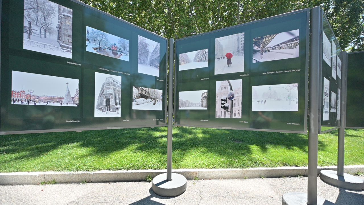 Las mejores instantáneas del concurso 'Filomena, a mi pesar' decoran el Paseo de Carruajes, en el Parque del Retiro, como parte del proyecto 'Re-Planta Madrid'.