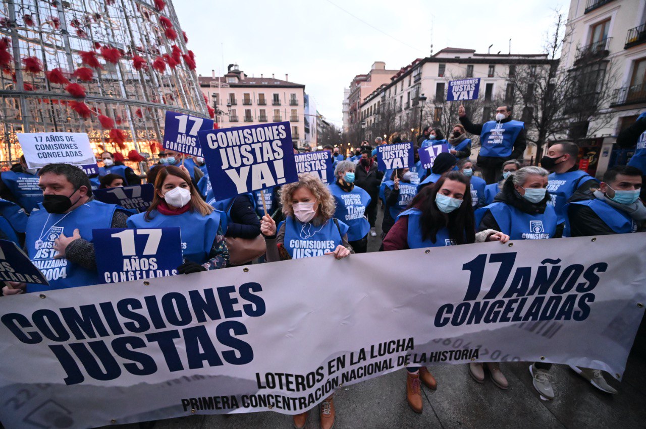 El gremio de loteros se ha concentrado frente al Teatro Real para reivindicar la subida de las comisiones que llevan 17 años congeladas. Loteros en la Lucha es la plataforma que ha convocado esta manifestación, así como el cierre de las administraciones durante ese mismo día del sorteo de la Lotería de Navidad.