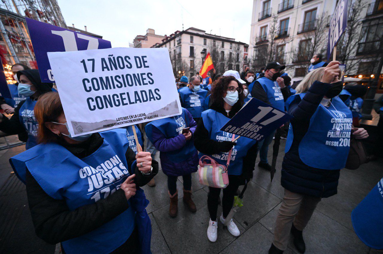 El gremio de loteros se ha concentrado frente al Teatro Real para reivindicar la subida de las comisiones que llevan 17 años congeladas. Loteros en la Lucha es la plataforma que ha convocado esta manifestación, así como el cierre de las administraciones durante ese mismo día del sorteo de la Lotería de Navidad.