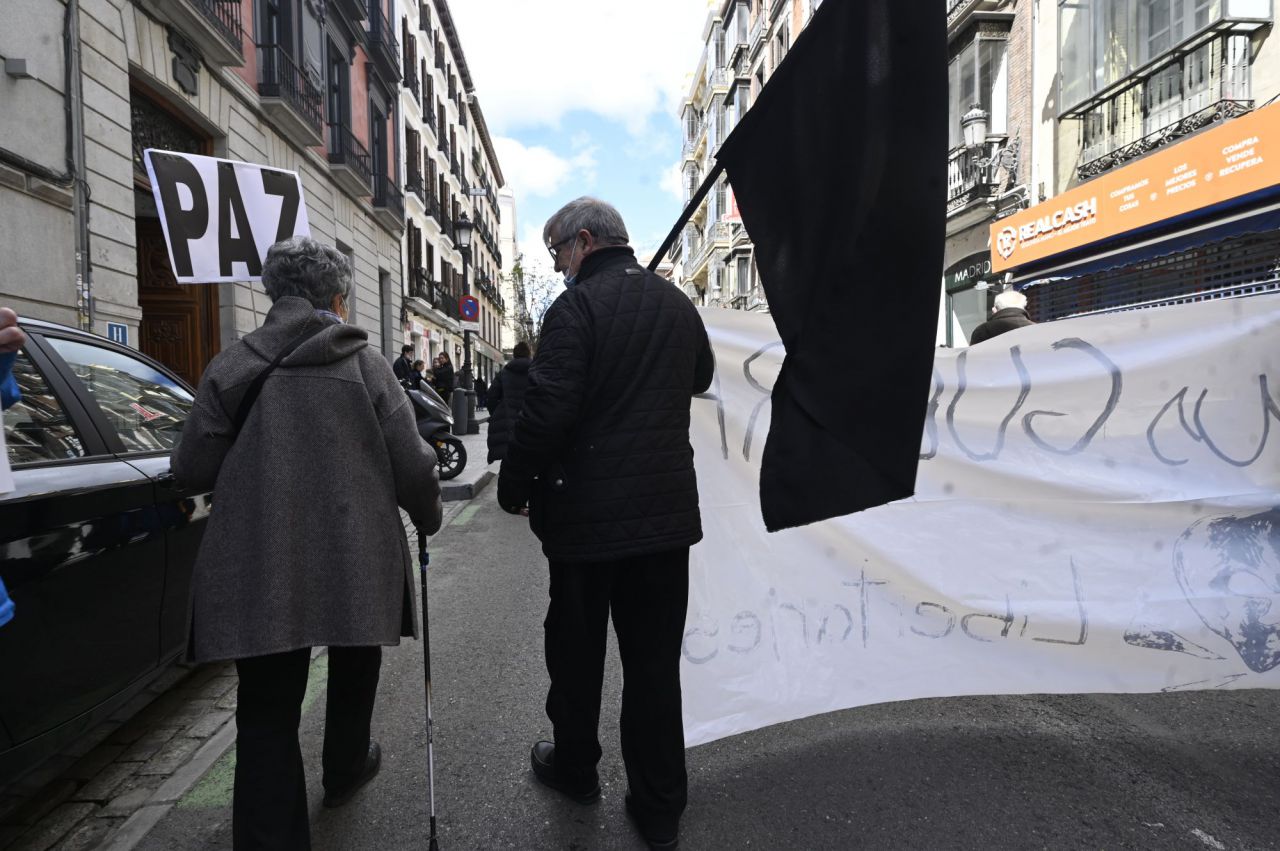 En torno a 250 personas han marchado este domingo en Madrid para exigir el fin de la guerra en Ucrania y contra la "injerencia imperialista" de la OTAN, así como contra el aumento del gasto militar.