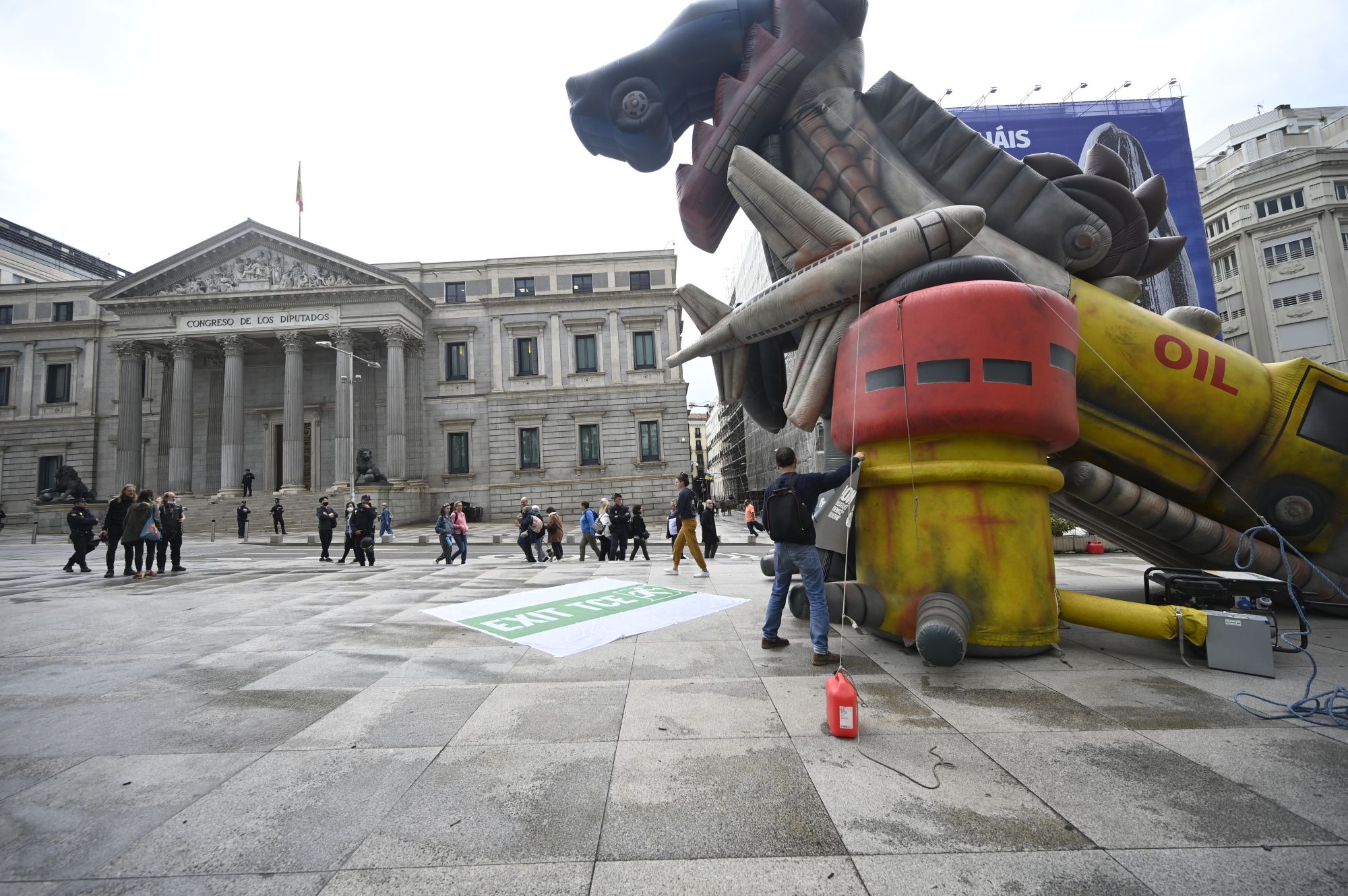 Miembros de Ecologistas en Acción se han manifestado este martes frente al Congreso con un dinosaurio gigante para protestar contra el lavado verde la industria fósil en nuestro país.