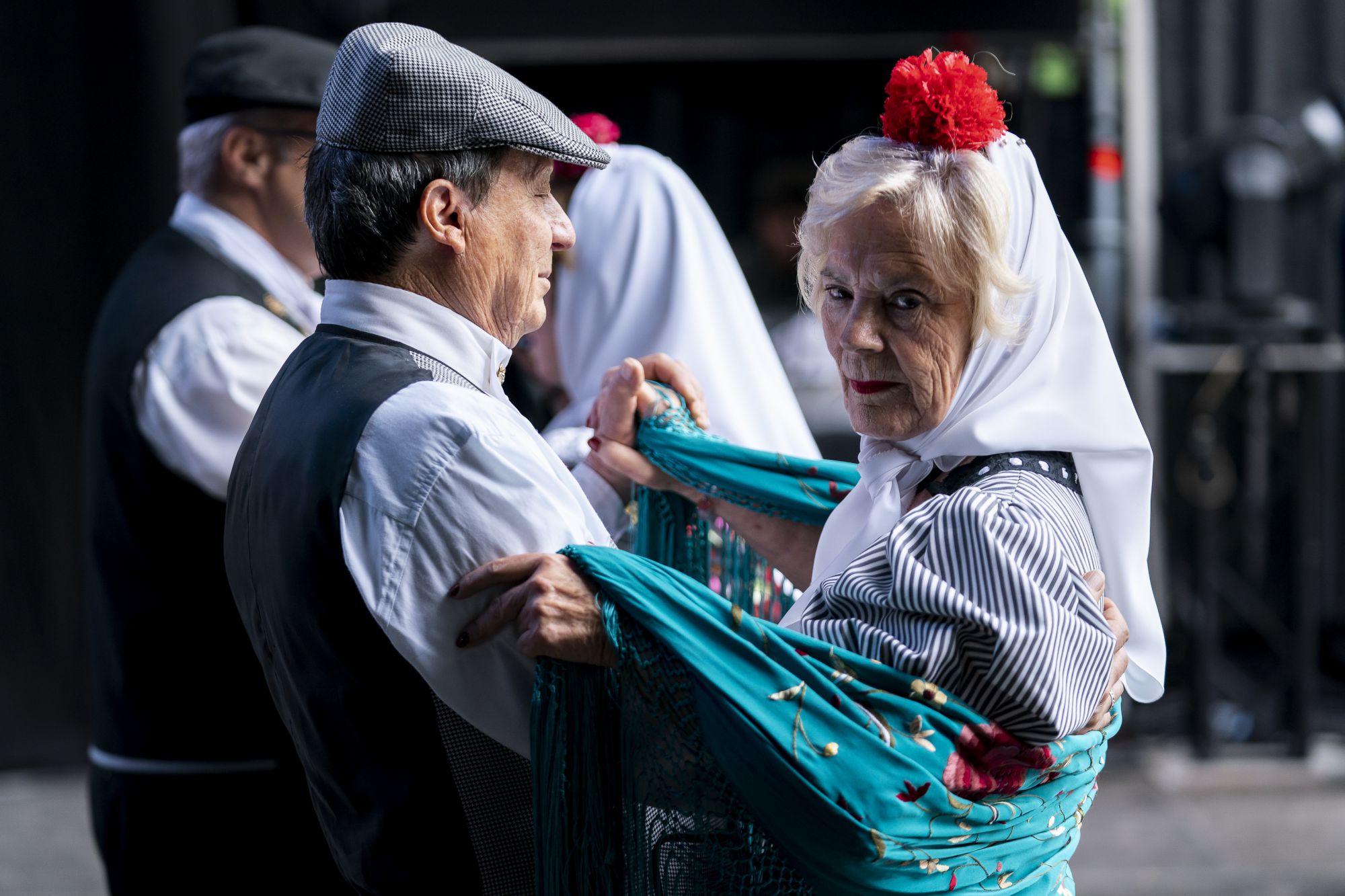 El folclore regional, de la mano de los chulapos y las chulapas, ha tomado las riendas en este segundo día de las Fiestas de San Isidro. Las Vistillas ha sido el escenario elegido esta mañana para la actuación de la Federación de Grupos Tradicionales Madrileños, que ha incluido bailes castizos, fundamentalmente chotis y pasodobles, goyescos y zarzuelas.