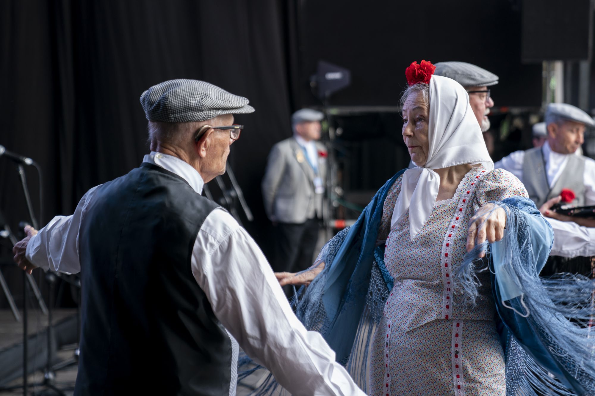 El folclore regional, de la mano de los chulapos y las chulapas, ha tomado las riendas en este segundo día de las Fiestas de San Isidro. Las Vistillas ha sido el escenario elegido esta mañana para la actuación de la Federación de Grupos Tradicionales Madrileños, que ha incluido bailes castizos, fundamentalmente chotis y pasodobles, goyescos y zarzuelas.