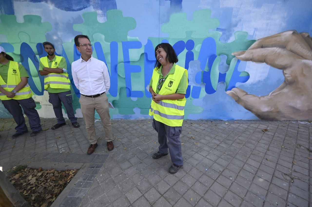 Martín Casariego, concejal de San Blas-Canillejas, ha inaugurado este viernes un mural colaborativo de arte urbano en el que se han plasmado los valores de la convivencia. El mural se ha colocado en el Espacio de Inclusión y ha sido realizado por el colectivo Ulitza-Oversidez y la Unidad Distrital de Colaboración.