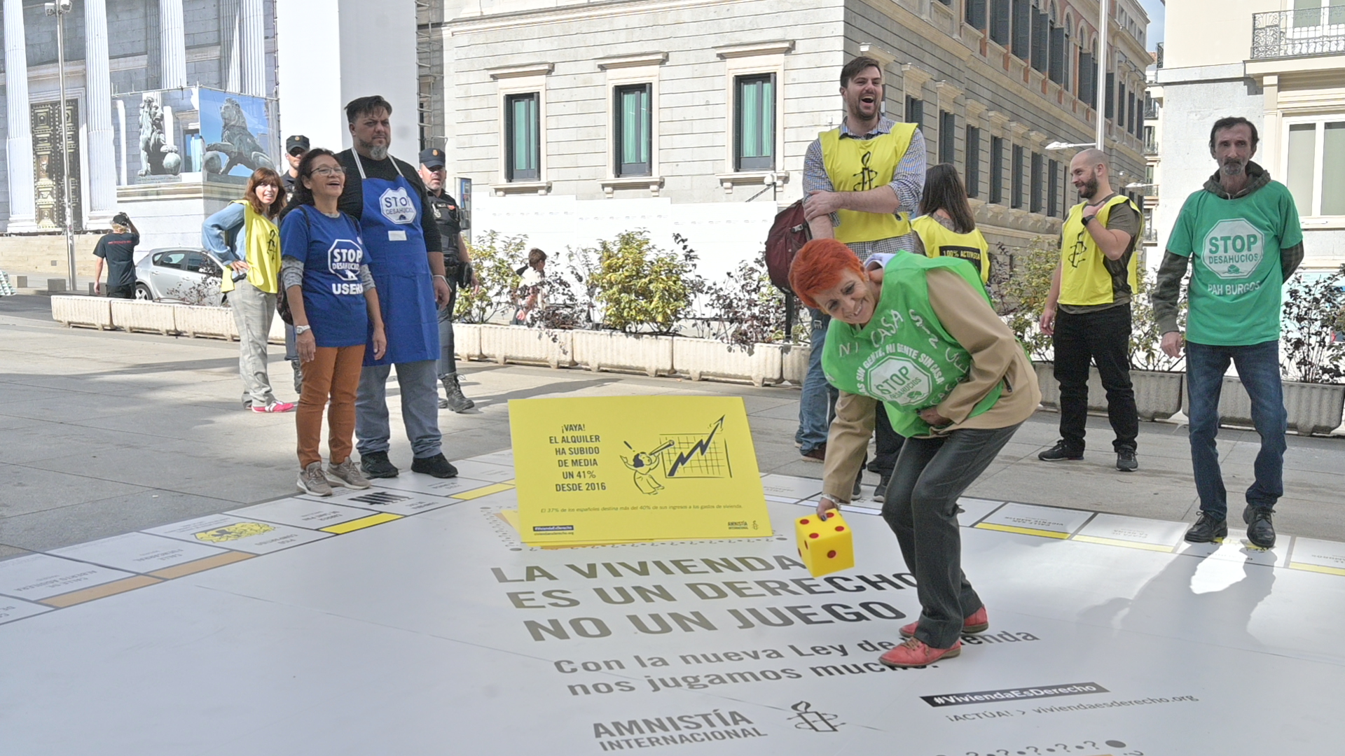 Amnistía Internacional ha denunciado frente al Congreso de los Diputados el retraso en la Ley de Vivienda, mediante la instalación de un Monopoli gigante. Con este popular juego de simulación del mercado inmobiliario, los convocantes han dado la vuelta a la lógica financiera y especuladora, exponiendo los obstáculos para el acceso y disfrute del derecho a la vivienda a los que se enfrenta la población española. (237 visitas)