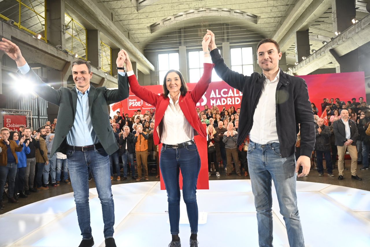 Reyes Maroto, acompañada del presidente del Gobierno, Pedro Sánchez, y del candidato a presidir la Comunidad de Madrid, Juan Lobato, ha presentado su candidatura a la Alcaldía de la capital para el 28-M.
