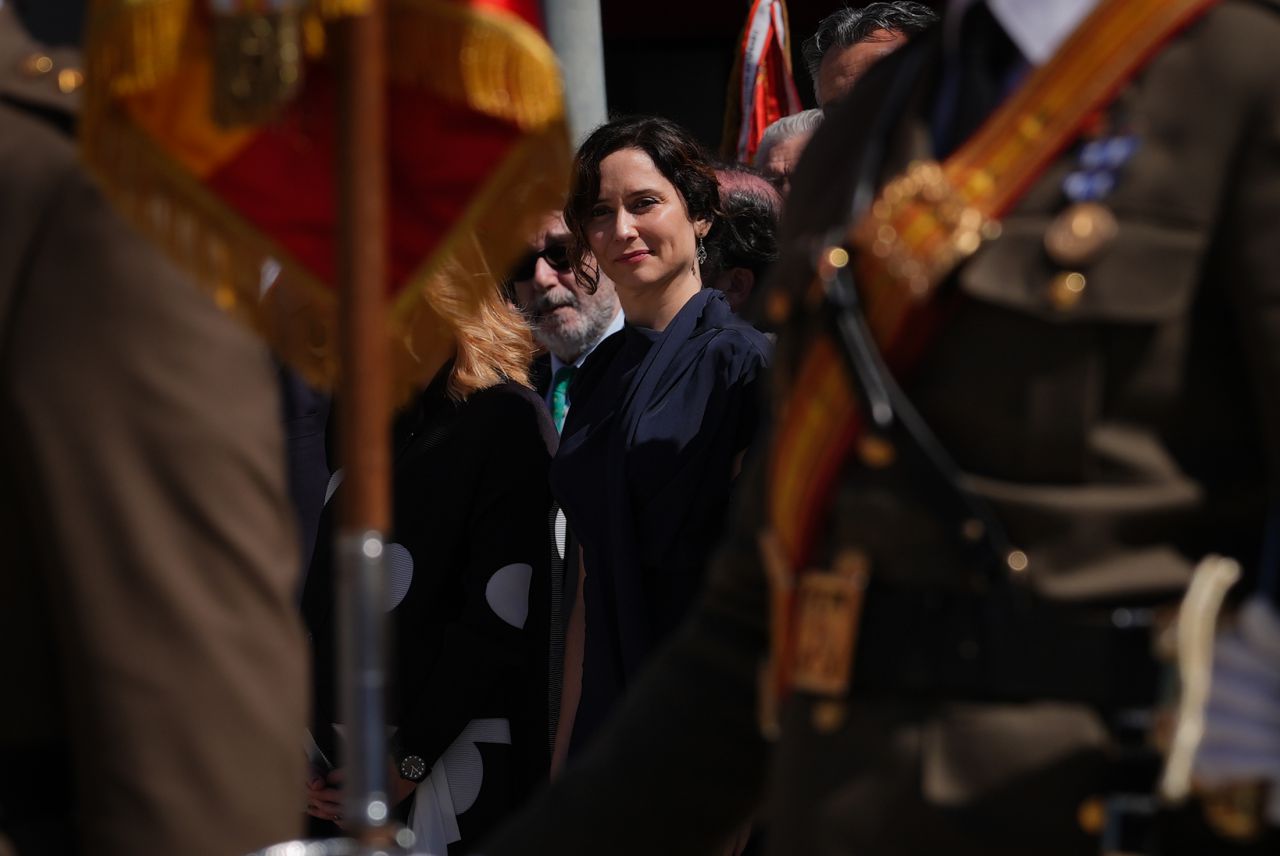 La presidenta de la Comunidad de Madrid, Isabel Díaz Ayuso, ha acudido esta mañana al solemne acto de jura de bandera de civiles en el municipio de Alcobendas, después de su último choque con el Gobierno central