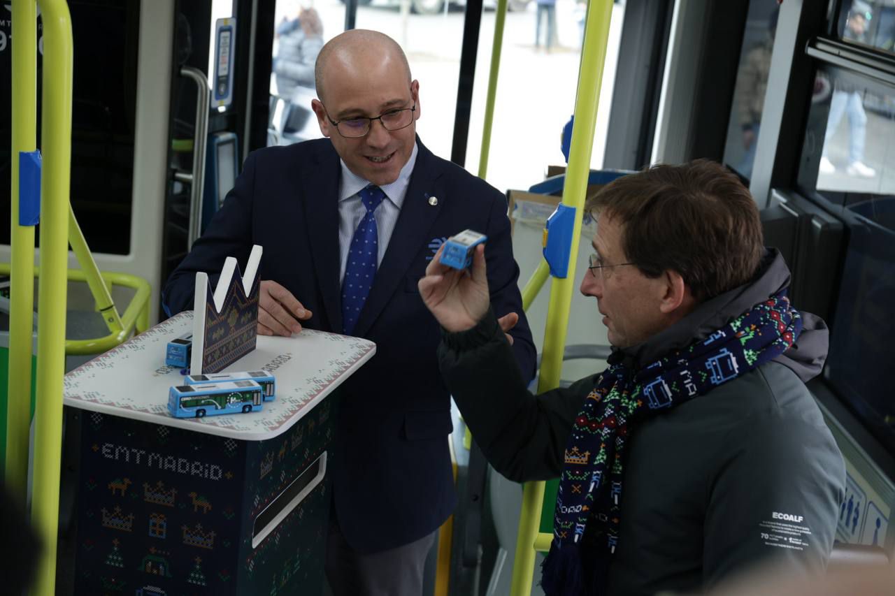 Este martes, en la plaza de Cibeles, el bus de la Navidad de EMT Madrid ha contado con la presencia del alcalde de Madrid, José Luis Martínez-Almeida, quien ha estado acompañado por Borja Carabante, delegado de Urbanismo, Medio Ambiente y Movilidad.