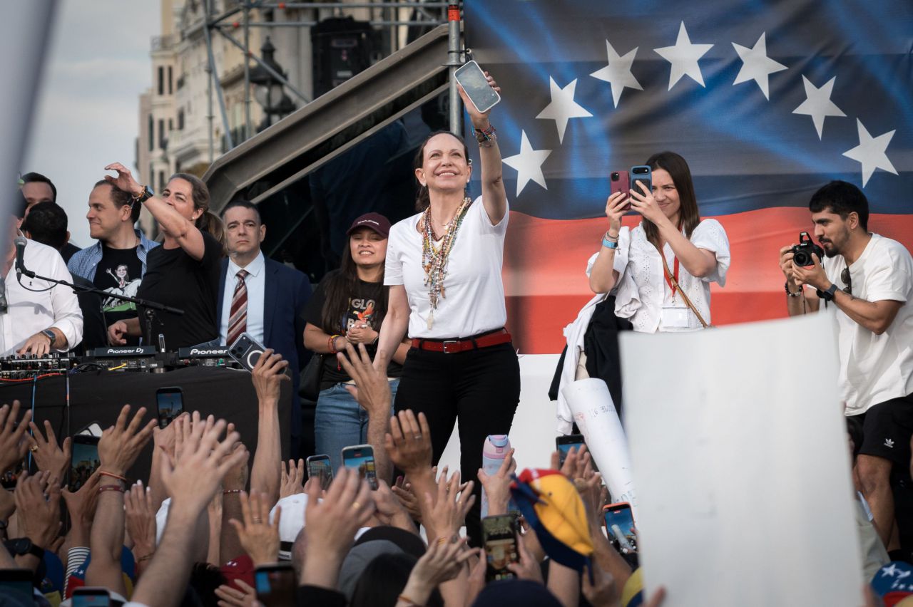 Unas 11.000 personas, según la Delegación del Gobierno, se concentraron este sábado en la Puerta del Sol para recibir a la líder opositora venezolana María Corina Machado, que recibía la Medalla de Oro de la Comunidad de Madrid. (137 visitas)