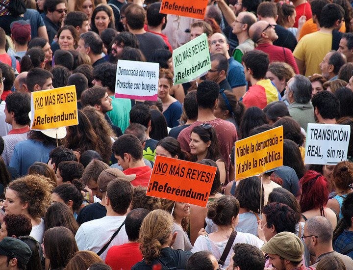 Miles de personas han abarrotado la tarde de este lunes la Puerta del Sol de Madrid secundando la convocatoria surgida desde las redes sociales para pedir un cambio en la forma de Estado que dé paso a una República, después de que el Rey haya abdicado en favor de su hijo, el Príncipe de Asturias.