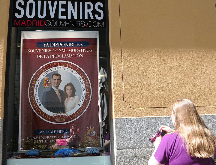 Tienda para turistas con souvenirs conmemorativos de la proclamación del nuevo rey
