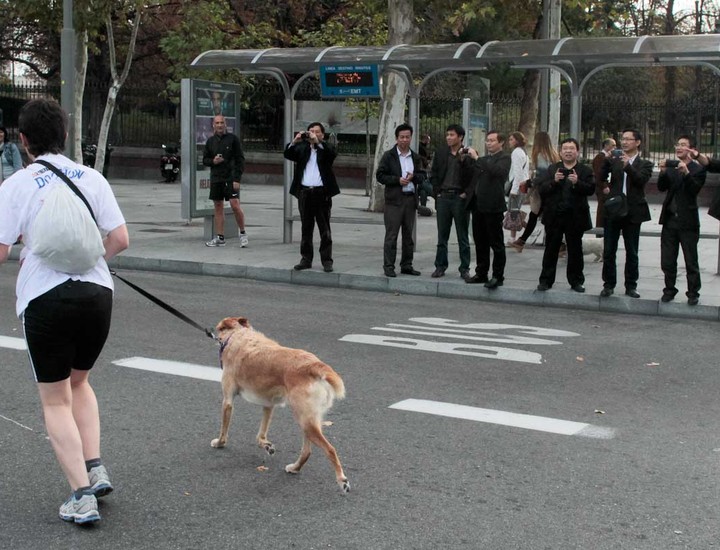 Un grupo de turistas japoneses hacen fotos al paso del Perroton 2014 por la Puerta de Alcalá.