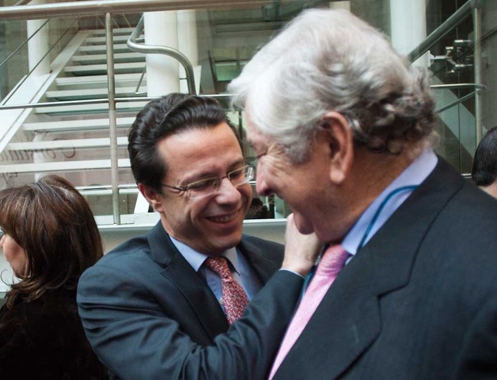 Los exconsejeros de sanidad de la Comunidad de Madrid, Javier Fernández-Lasquetty y Javier Rodriguez, charlan durante el ágape el mismo día del nombramiento del nuevo responsable de la cartera más complicada del Gobierno regional.