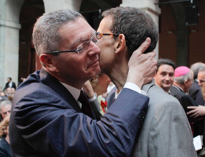 Alberto Ruiz-Gallardón saluda con un cariñoso abrazo a Pedro Zerolo, concejal socialista en el Ayuntamiento de Madrid y 'número tres' de la lista de Ángel Gabilondo