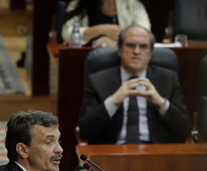José Manuel López, portavoz de Podemos en la Asamblea de Madrid, y Ángel Gabilondo, portavoz del PSOE en la Asamblea de Madrid, en la sesión de investidura