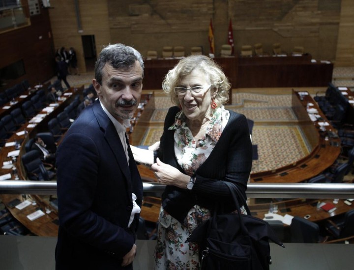 José Manuel López, portavoz de Podemos en la Asamblea de Madrid, y Manuela Carmena, alcaldesa de Madrid, en la sesión de investidura