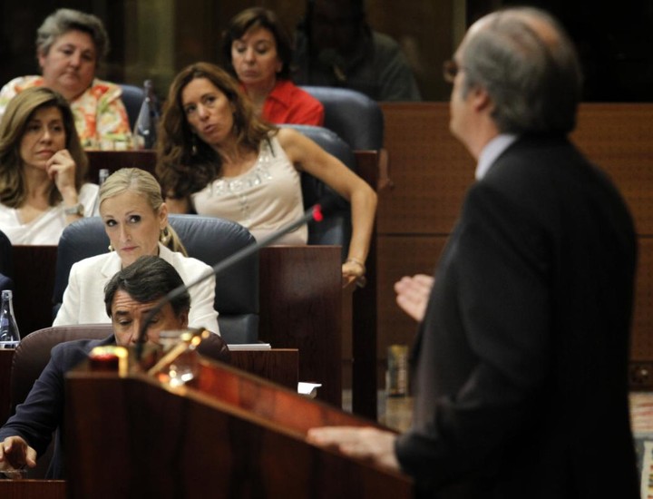 Ángel Gabilondo, portavoz del PSOE en la Asamblea de Madrid, durante la sesión de investidura. Al fondo, Cristina Cifuentes e Ignacio González
