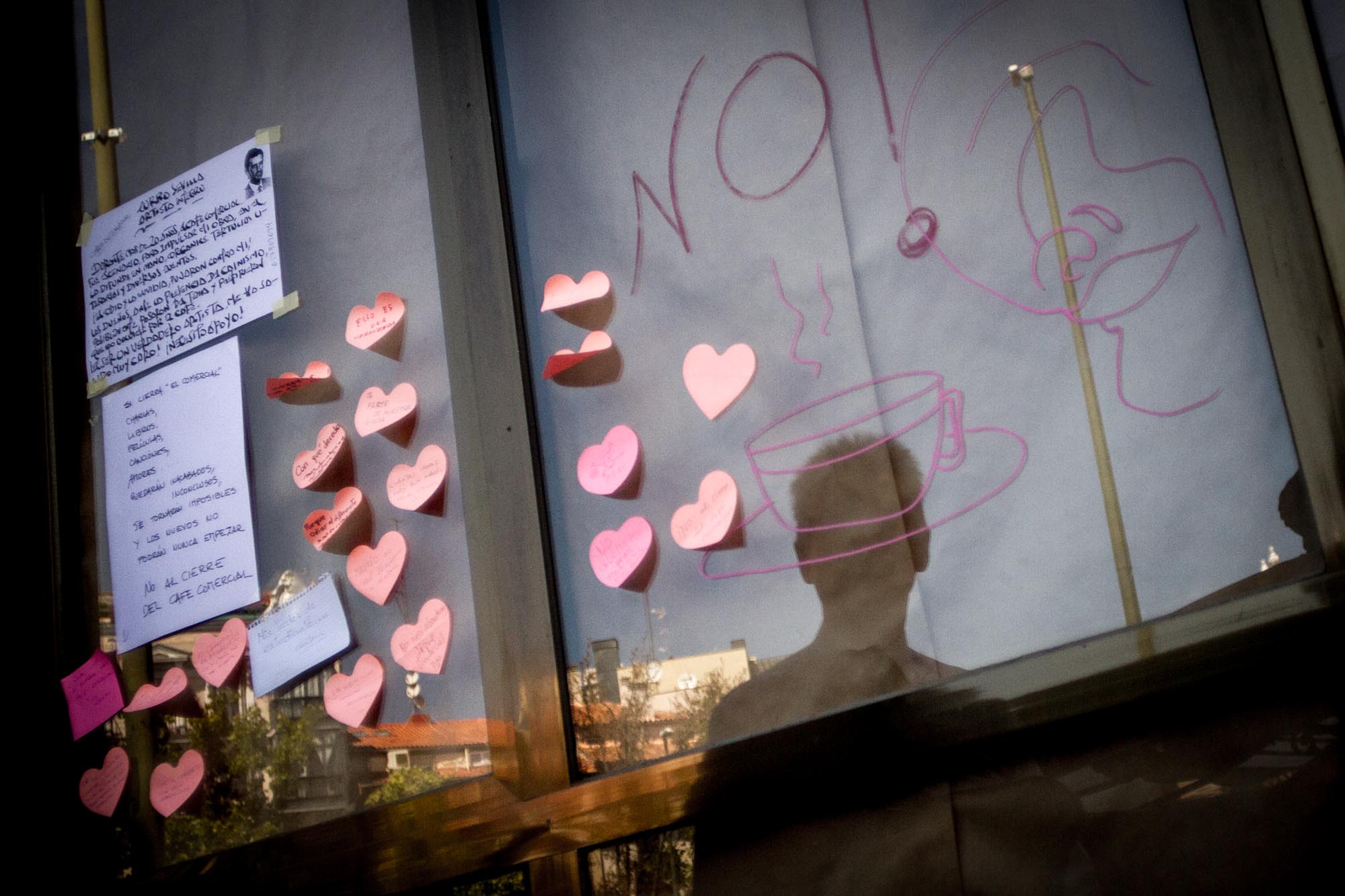 Cientos de personas se han acercado al Cafe Comercial para dejar en post-it y papeles en forma de corazón recuerdos y peticiones para que no se cierre.
