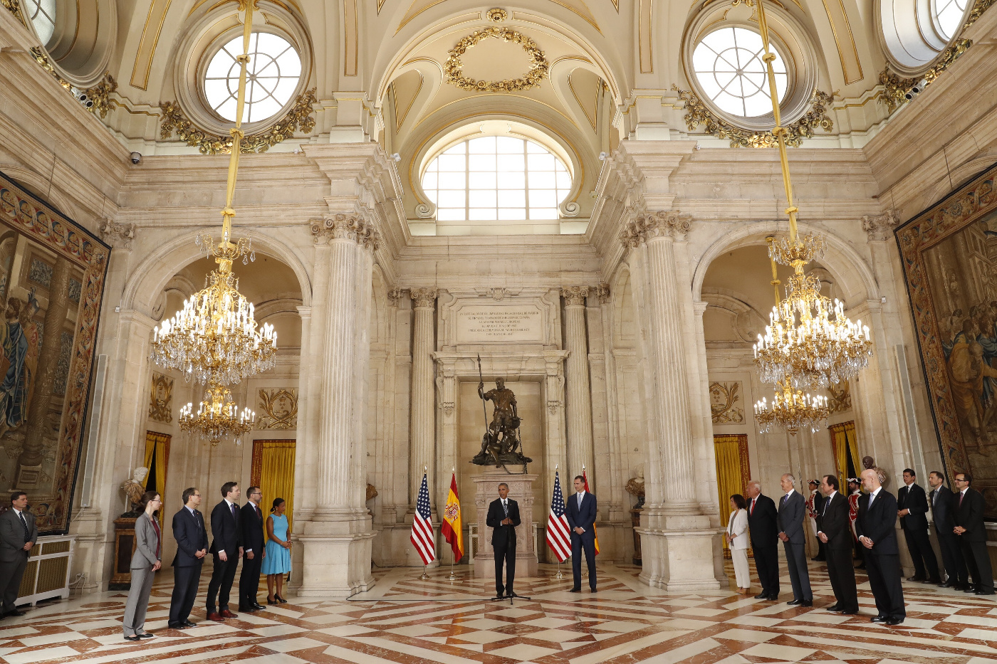 El presidente de EEUU, Barack Obama, desembarcó este sábado en Madrid como parte de su visita relámpago que ha debido acortar por el reciente tiroteo de Dallas. El mandatario ha departido este domingo con el rey Felipe VI en el Palacio Real y con el presidente del Gobierno en funciones, Mariano Rajoy, en Moncloa.