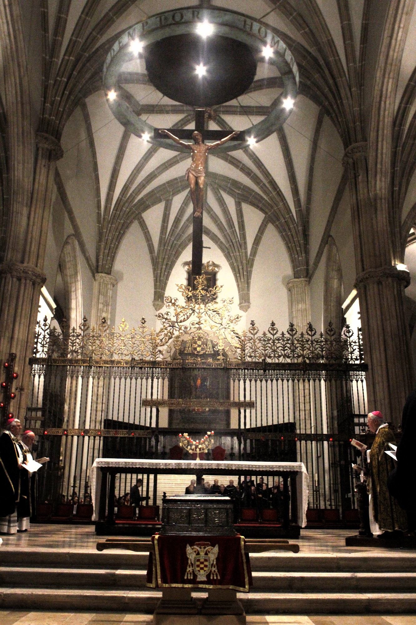Los restos del cardenal Cisneros se han trasladado este martes a la girola de la catedral de Alcalá de Henares cuando se cumplen 500 años de su muerte, junto a un relieve conmemorativo obra del escultor Julio López.