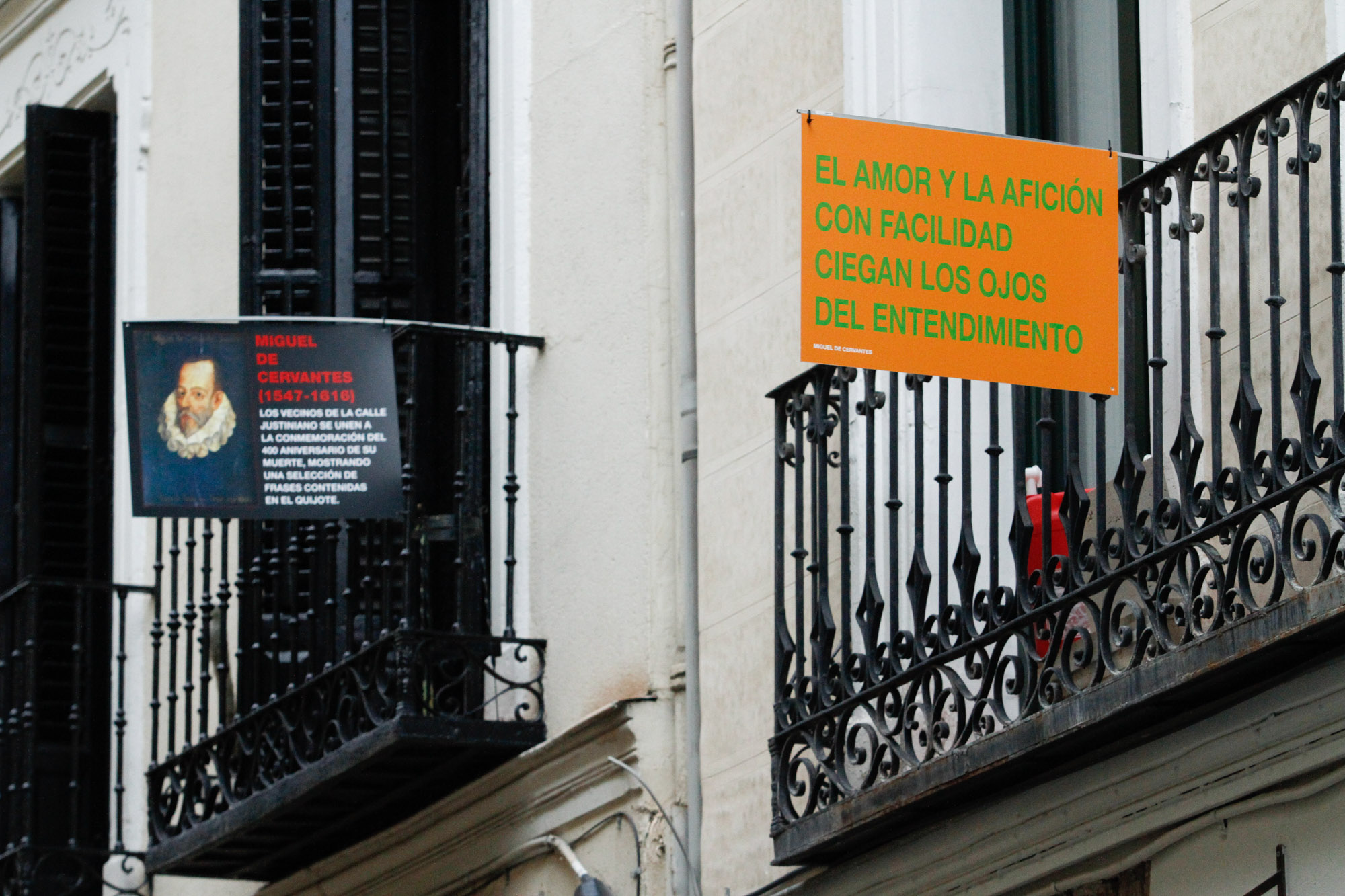 Los vecinos de la céntrica calle Justiniano se unen a las conmemoraciones por el cuarto centenario de la muerte de Miguel de Cervantes sacando a los balcones frases extraídas del Quijote.