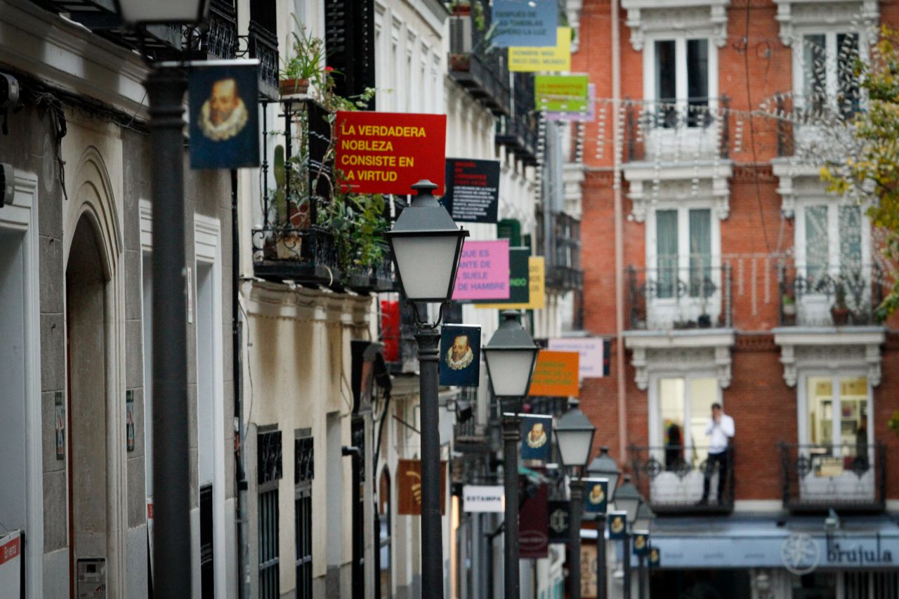 Vecinos de la calle Justiniano han colgado carteles con frases extraídas de El Quijote sumandose así a la celebración del cuarto centenario del fallecimiento de Miguel de Cervantes Saavedra.