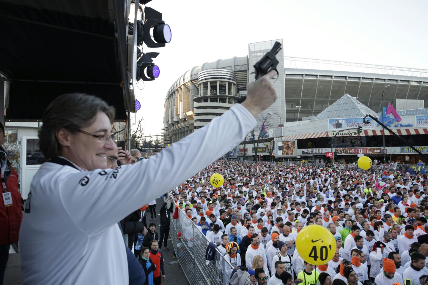 Marta Higuera, primera teniente de alcalde del Ayuntamiento de Madrid, da el pistoletazo de salida de la San Silvestre 2016.