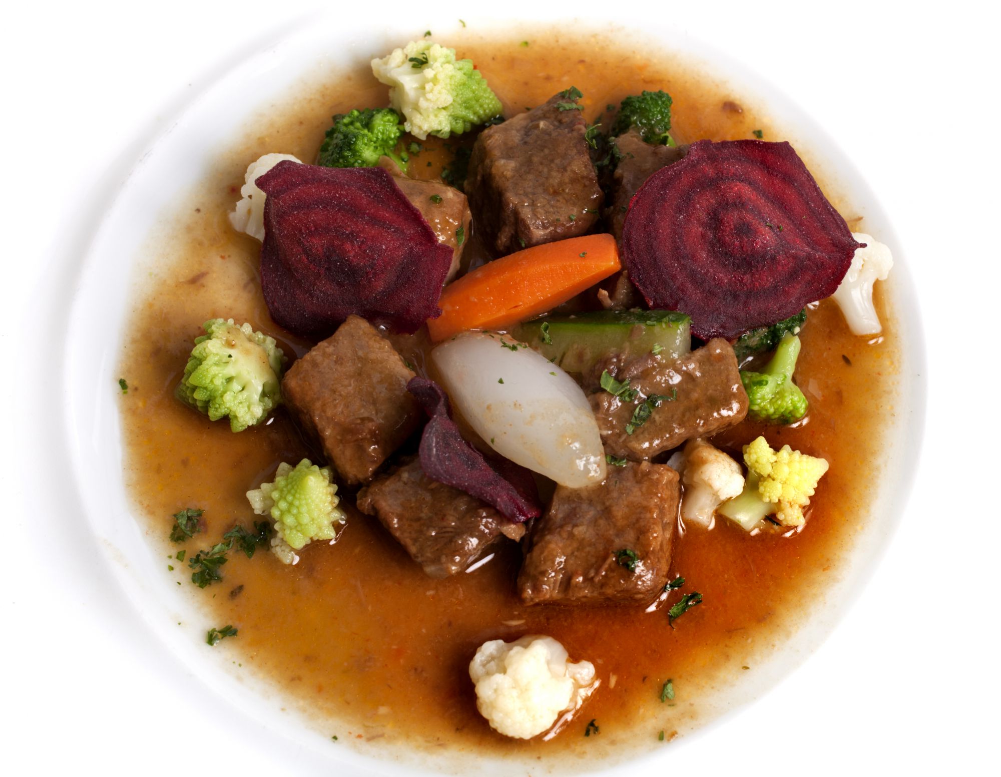Jardinera de ternera IGP de la Sierra de Guadarrama, vegetales torneados y chips de remolacha.