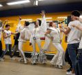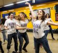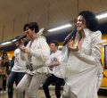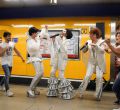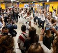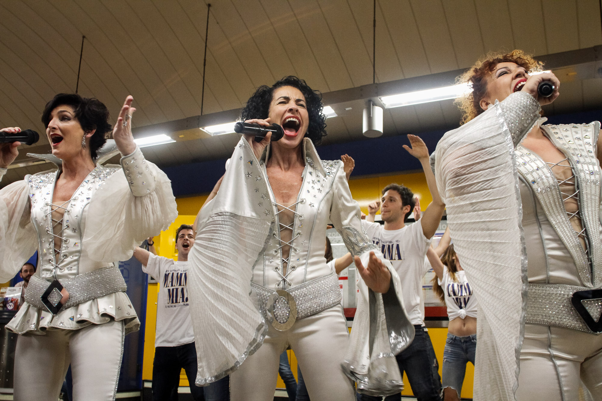 El reparto de Mamma Mía! ha actuado este martes en el Metro de Madrid. Primero ha recorrido la línea 3 desde Plaza de España hasta Callao y después ha realizado dos de sus números más emblemáticos. El musical se representa desde el pasado mes de marzo en el restaurado Teatro Coliseum de Madrid, en pleno corazón de la Gran Vía madrileña.