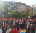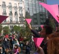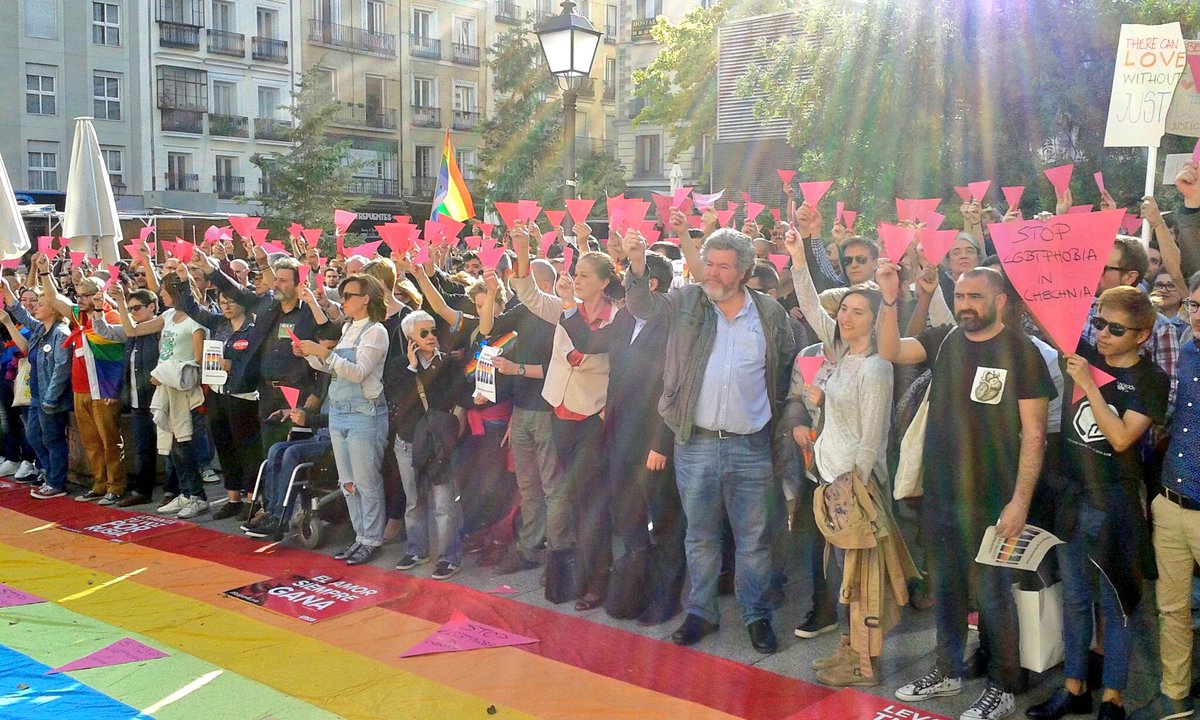 Decenas de personas se han manifestado portando triángulos rosas en la plaza Pedro Zerolo para que se investigue la posible vulneración de los Derechos Humanos que se está llevando a cabo en Chechenia, donde los homosexualidades están perseguidos y castigados.