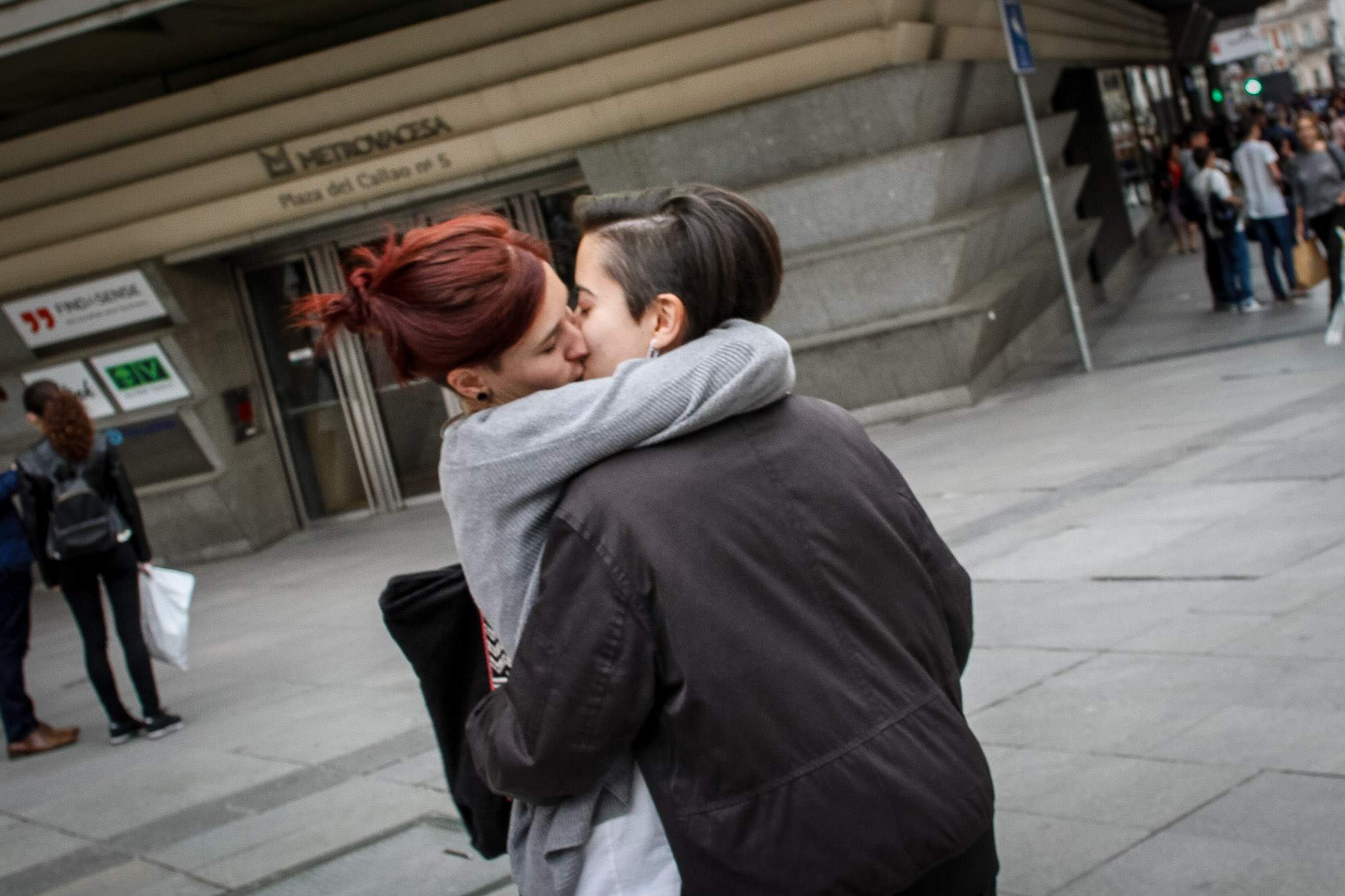 Dos mujeres besándose en la Plaza de Callao.