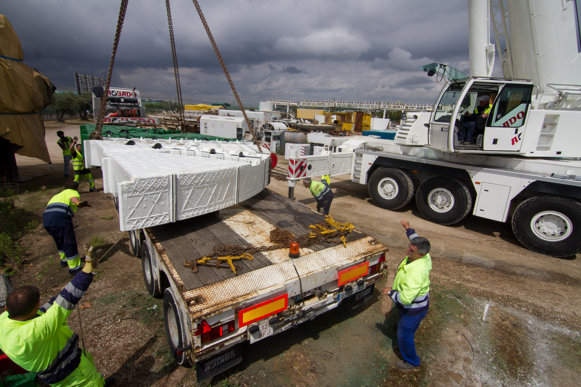 Maniobra de posado de una de las partes de la tuneladora en el tráiler.