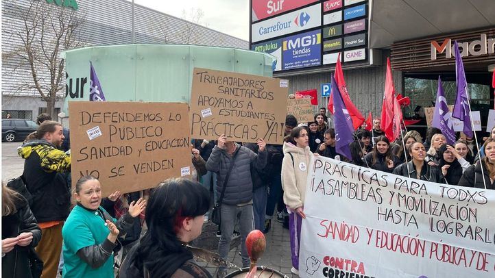 Al grito de 'Prácticas para todos' y secundados por trabajadores sanitarios que portaban pancartas de apoyo a sus reivindicaciones, los estudiantes han reclamado una solución a la falta de prácticas que padecen los alumnos de los centros públicos, frente a los de centros privados que, según denuncian, "sí cuentan con prácticas" para concluir su formación académica debido a que "se paga para que este alumnado pueda acceder a ellas", sostienen. Desde la Comunidad de Madrid niegan este extremo en lo referente a los hospitales de titularidad y gestión pública, mientras que en el caso de los privados han precisado que "tienen libertad para hacerlo".