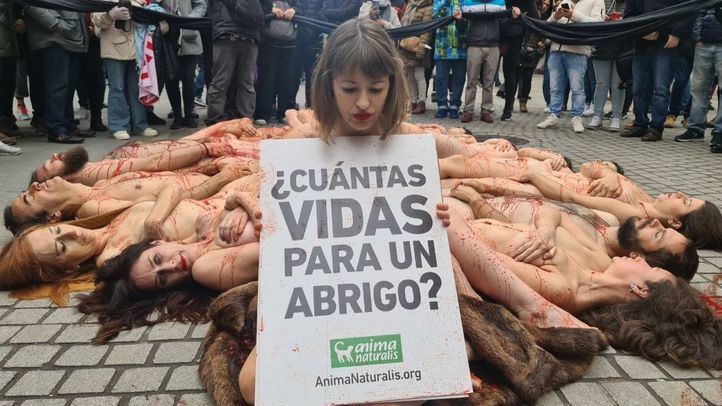 En esta protesta los participantes se han manifestado completamente desnudos, rociados con sangre artificial y amontonados unos encima de otros, "como quedan los cuerpos de los animales sin vida una vez les han arrancado su piel".