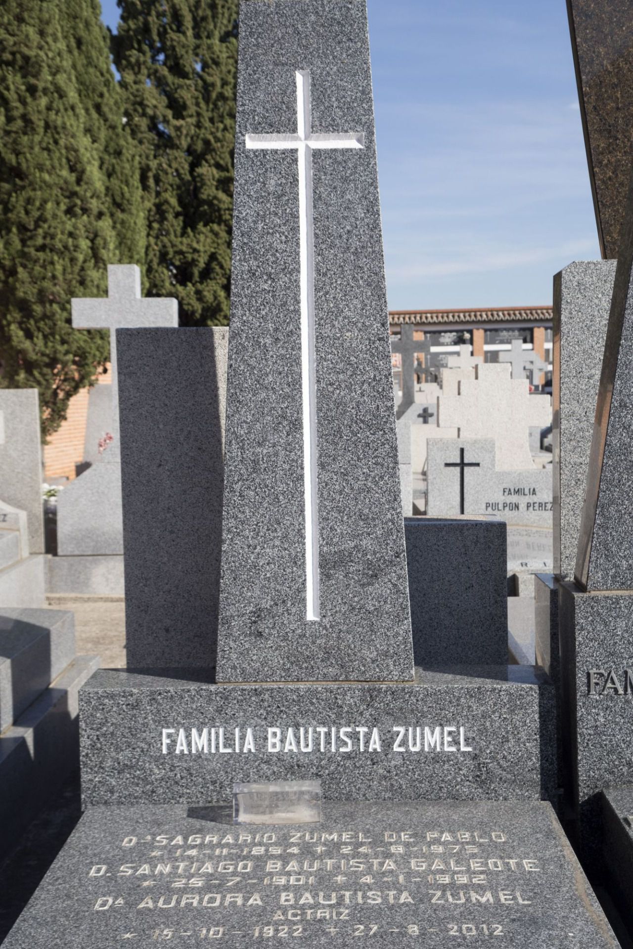 Consta de una sobria lápida a cuya cabecera se levanta una pirámide truncada en la que se grabó una cruz blanca. Debajo se lee: Familia Bautista-Zumel. Todo el conjunto en mármol gris. Se huye del barroquismo que imperó durante el siglo XIX y buena parte del XX, apostando por la sencillez. En la lápida figuran los nombres de los padres de la actriz y sus fechas de nacimiento y defunción: Sagrario Zumel de Pablo *14-11-1894 +24-8-1975; Santiago Bautista Galeote *25-7-1901 +4-1-1992. Finalmente aparece: Aurora Bautista Zumel. Actriz. *15-10-1922 +27-8-2012.